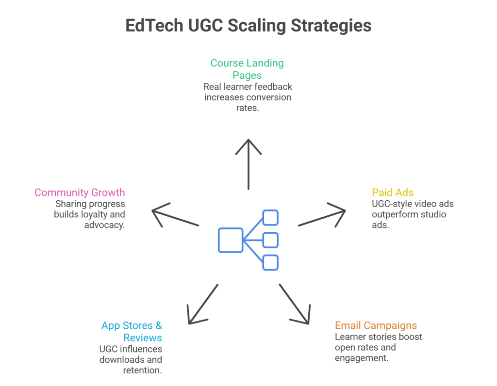 UGC on homepages, landing pages, and course pages boosts trust and time on site.